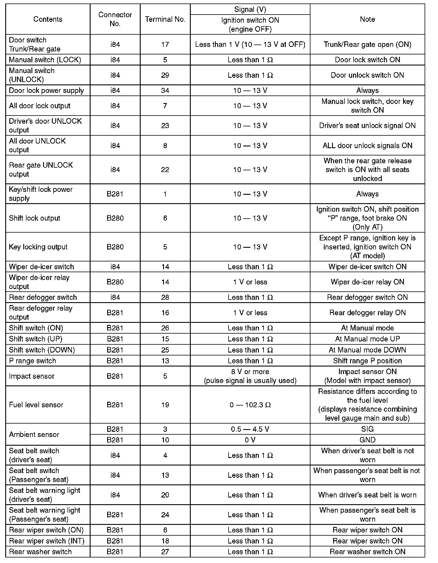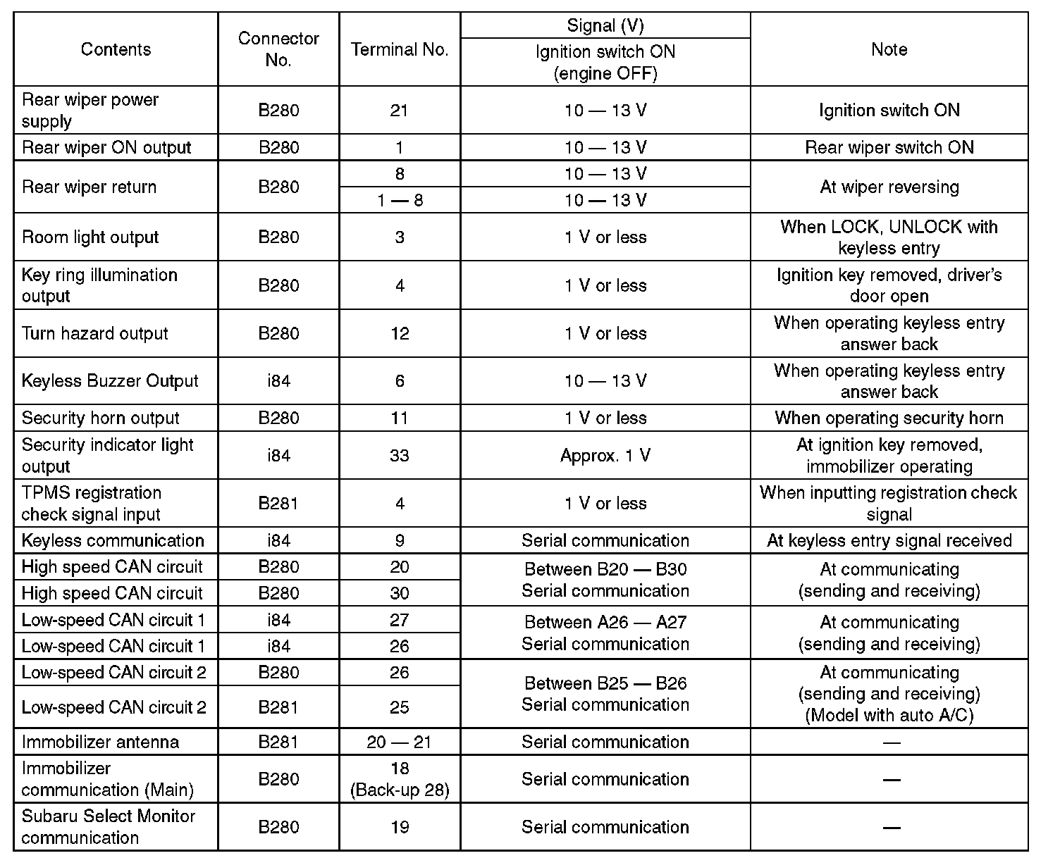 Pinout Values and Diagnostic Parameters