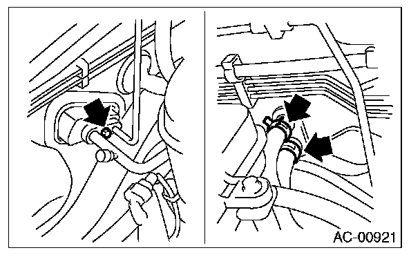4. Remove the bolts securing expansion valve and pipe in engine compartment. Release the heater hose clamps in engine compartment to remove the hoses.