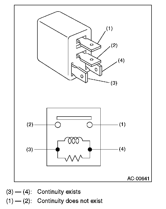 While applying battery voltage to the terminal between (3) and (4), check continuity between (1) and (2). If no continuity exists, replace the relay with a new part.