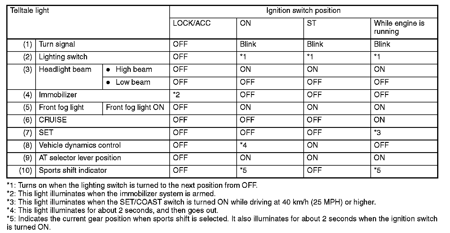 When everything is normal, the telltales should be ON, OFF or in other states as shown in the table according to ignition switch position.