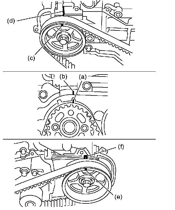 1. Use the ST to turn crankshaft. Align the mark (a) of sprocket to the cylinder block notch (b), and then ensure the right side cam sprocket mark (c), cam cap and cylinder head matching surface (d) or left side cam sprocket mark (e), timing belt cover notch (f) are properly adjusted.