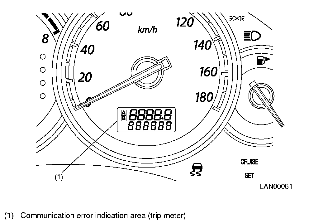COMMUNICATION ERROR INDICATIONS- If a fault occurs in the body integrated unit or LAN system (in any unit or the communication circuit), a communication error indication is given at the trip information display area on the combination meter.