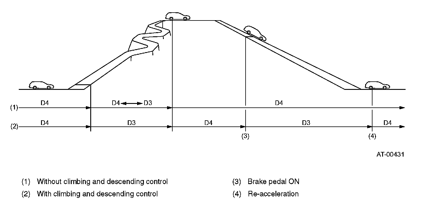 When the ATF temperature is low as in cases such as immediately after start in winter, upshifting to 4th is inhibited to quicken warm up. Upshifting to 4th is also inhibited if the ATF temperature becomes extremely high after severe driving, to prevent further temperature rise.