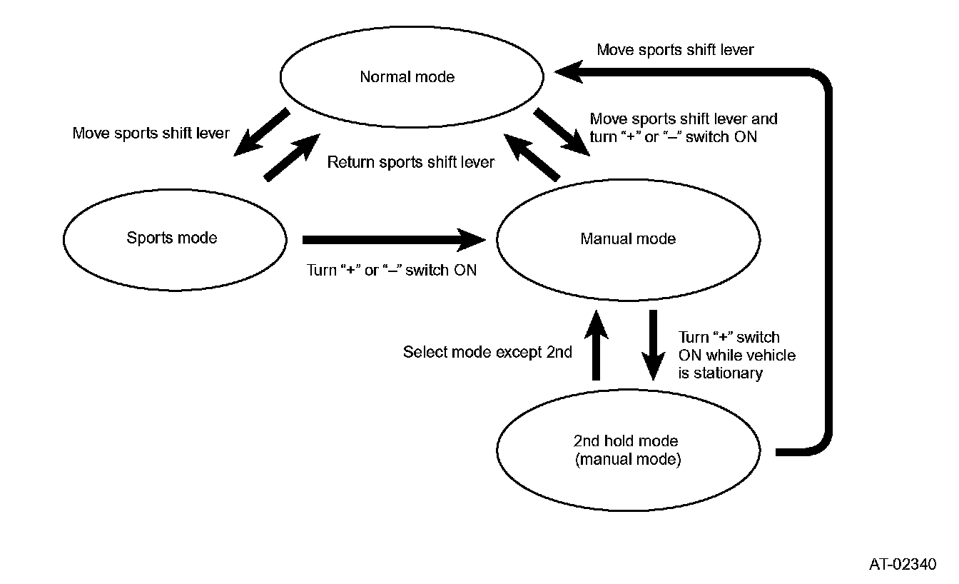 The gear upshifts each time the "+" switch is operated, however, when the vehicle speed is too low for the selected gear speed, the TCM inhibits further upshifting. If the vehicle speed becomes too slow for the current gear speed, a downshift will be made automatically to prevent engine stall. When the vehicle comes to a stop, the transmission will always be controlled to shift to 1st speed unless the vehicle was in Manual mode 2nd hold control.