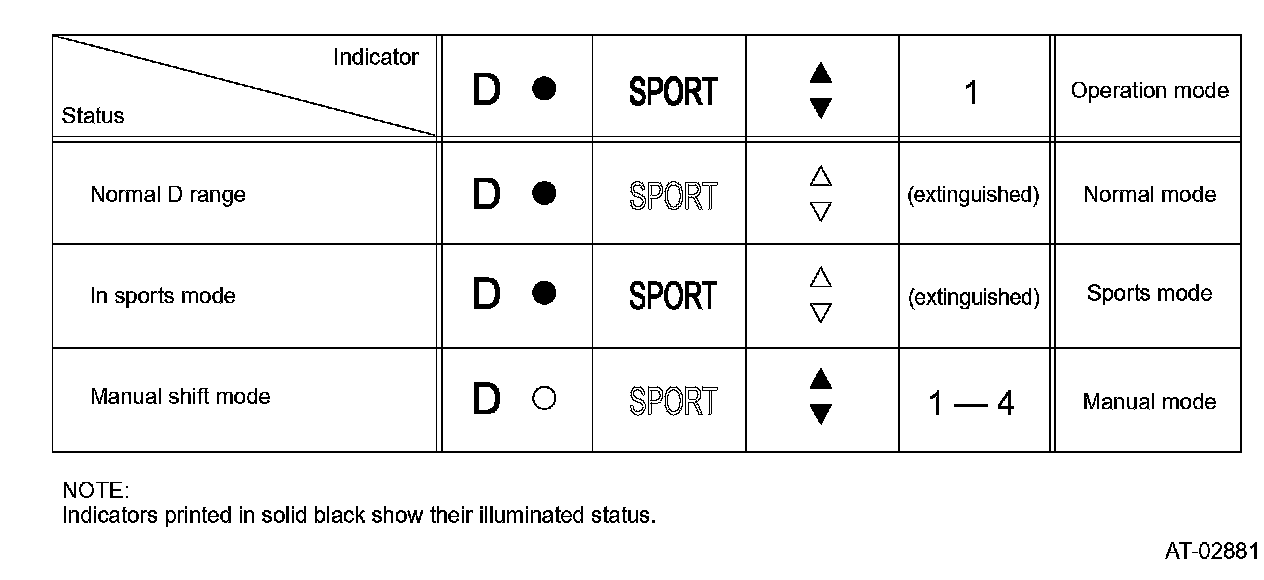 Illuminations of the various indicators on the combination meter are controlled in accordance with the shift pattern selection as shown in the table.
