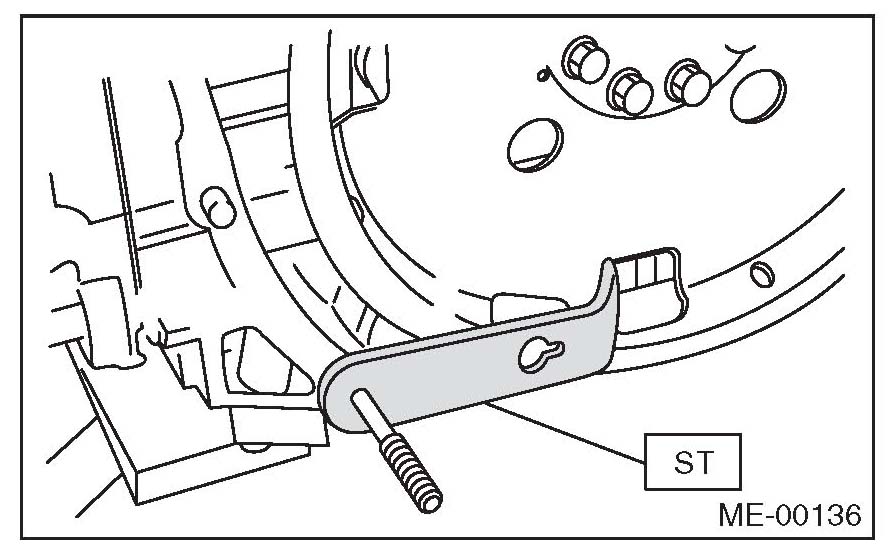 3) While checking the tightening angle with the ST, tighten the drive plate mounting bolts to the specified angle.