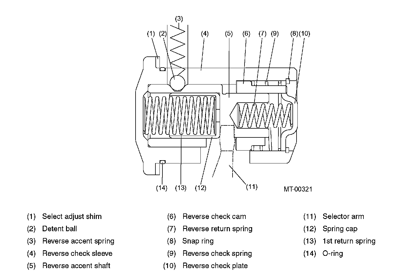 The reverse accent shaft has hollows in both ends. In the left end hollow are the 1st return spring and its cap and in the right end hollow is the reverse return spring, which pushes the shaft leftward.