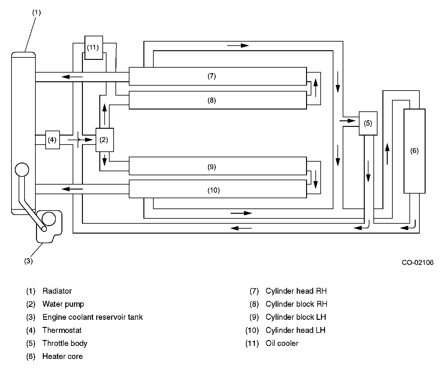 When the engine coolant temperature is below 80 °C (176 °F), the thermostat remains closed. The coolant flows through the bypass and heater circuits.