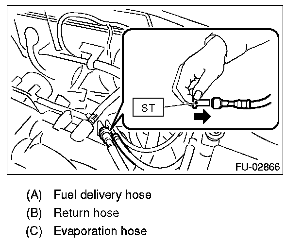 1. Disconnect the quick connector on the fuel delivery line and return line by pushing the ST in the direction of the arrow.