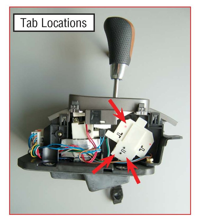 When diagnosing a vehicle with the A/T oil temp light flashing and code P1817 stored in memory, the diagnostics listed in the Service Manual for the Sport mode switch circuit need to be followed. In addition, the Sport mode switch and cover should also be checked to confirm correct operation. There is a possibility that during manufacturing of the switch cover, small pieces of plastic flashing were not cleared causing the switch pivot to intermittently stick affecting the switch operation. This could also cause the system to stay in Sport mode when the select lever is in the normal "D" position. You could use the SSMIII to read the "Tip mode switch" data to determine if the switch is operating correctly. If it is determined that it is not, the Sport mode switch cover should be checked using the following repair procedure.