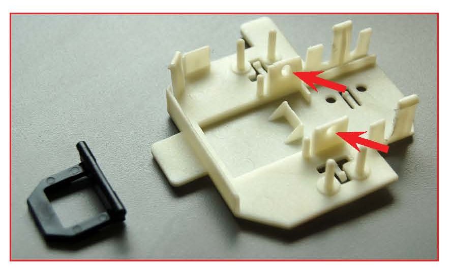 5) Remove the pivot plate from the Sport mode switch cover. Use a rattail file to remove any flashing from the holes of the Sport mode switch cover. Note: Only remove the flashing, do not enlarge the holes.