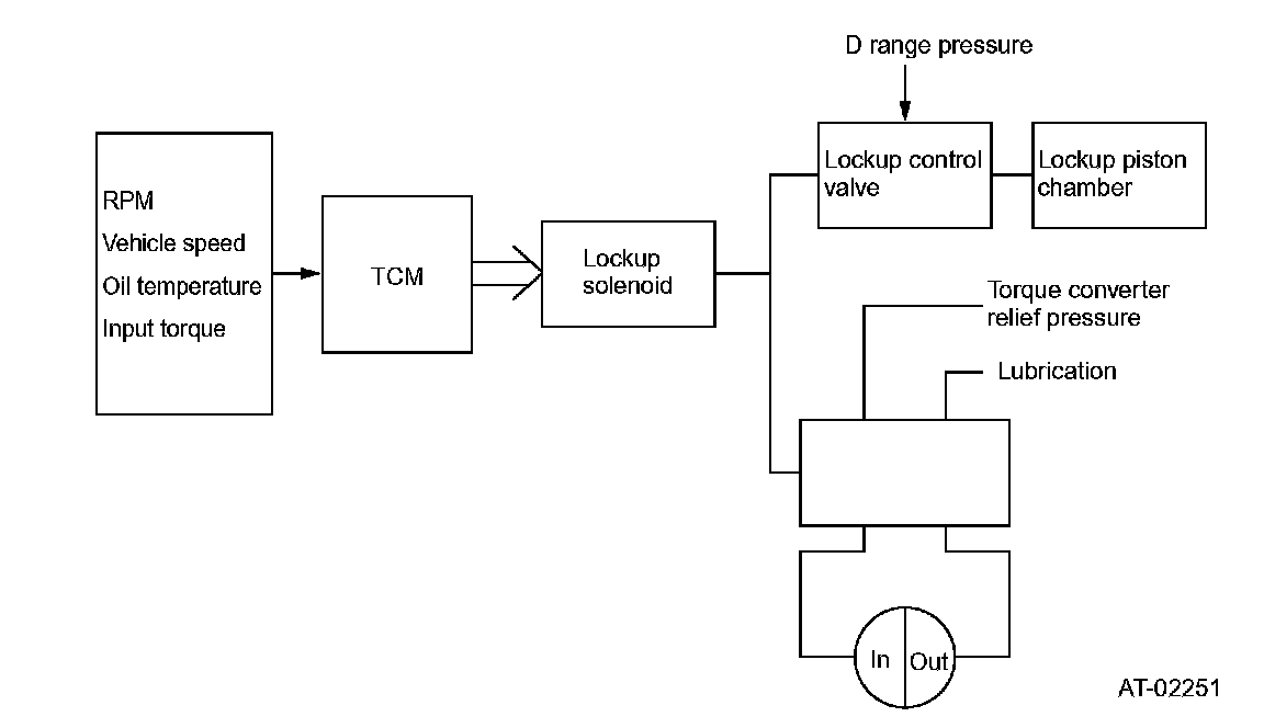 - Based on signals from the TCM, the lockup solenoid is controlled in order to let the lockup control valve operate and adjust apply pressure/release pressure, to consequently vary the lockup clutch engagement force.