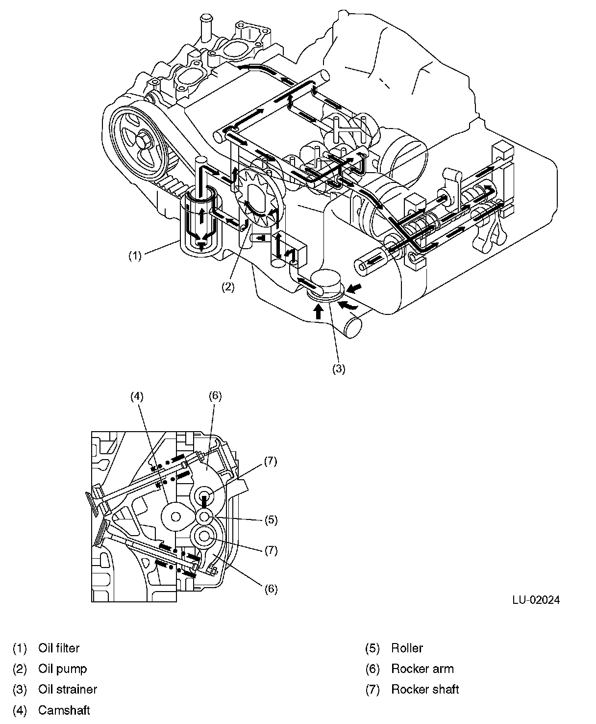 - The engine oil discharged from the oil pump is delivered to the journal bearings, connecting rod bearings, and other parts requiring lubrication and cooling through the oil filter, vertical passage in the right bank of the cylinder block, and the oil galleries in the right and left banks of the cylinder block.