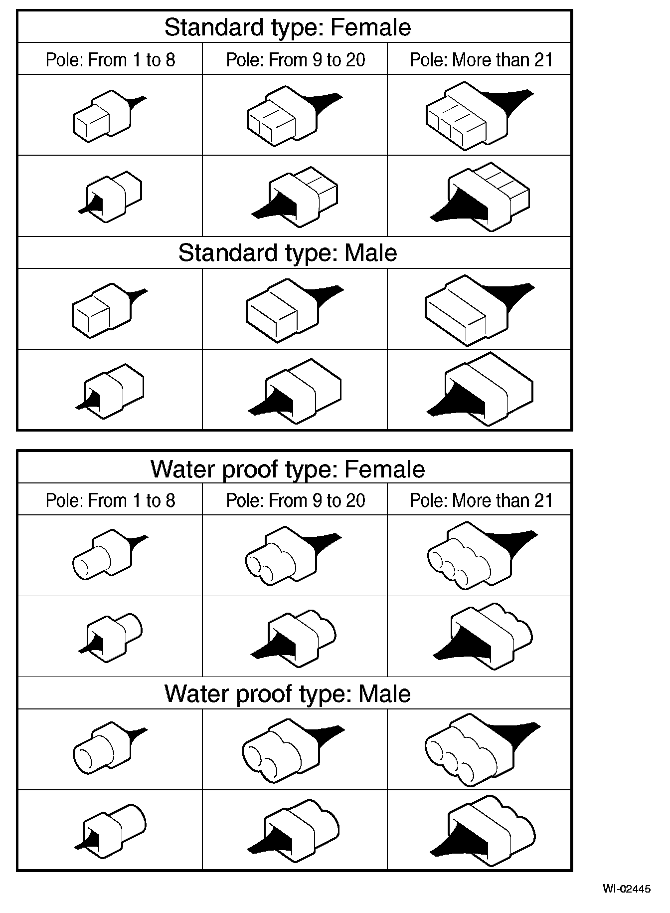A number of connector symbols are used in each wiring diagram to easily identify the wiring harness connectors.