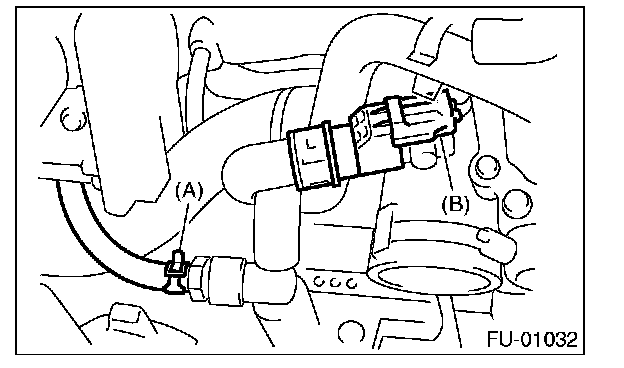 14. Disconnect the emission hose (A) and the connector (B) from the PCV hose assembly.