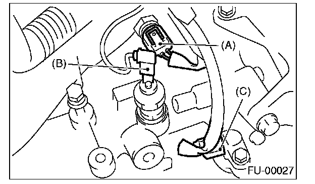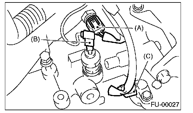 3. Connect the connector to the engine coolant temperature sensor (A), oil pressure switch (B) and crankshaft position sensor (C).
