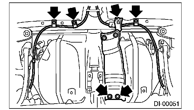 10) Remove the clamps and bracket of parking brake cable.