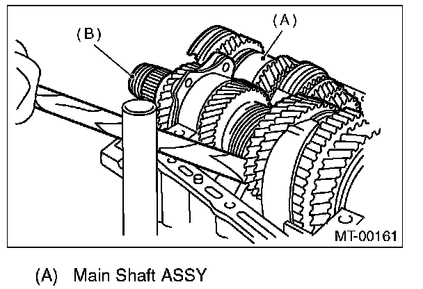 3) Install the main shaft assembly for single-range. Install the transmission case knock pin into the knock pin hole of needle bearing.