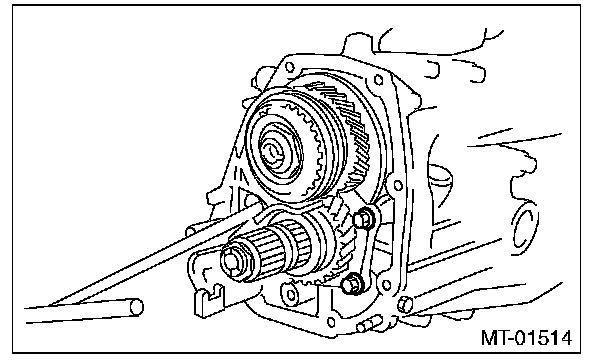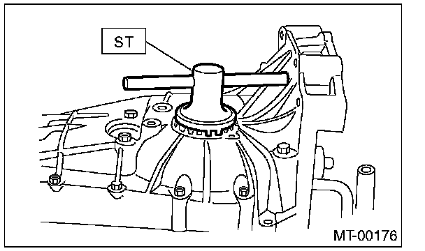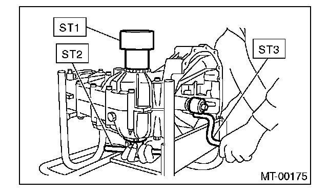 10) Screw the retainer assembly from the bottom into left case using ST2. Fit the ST3 on transmission main shaft. Shift the gear into 4th or 5th, and turn the shaft several times. Screw in the retainer while rotating the ST3 until a slight resistance is felt on ST2.
