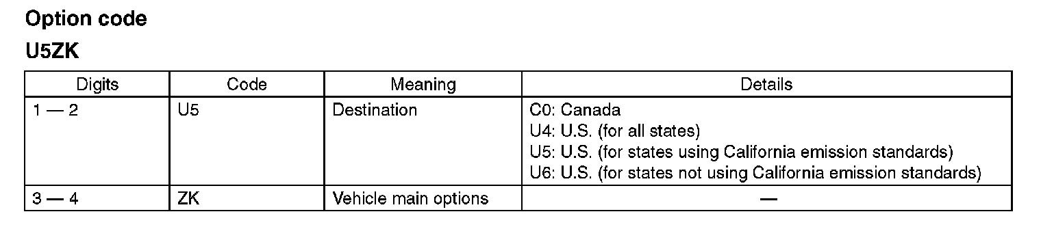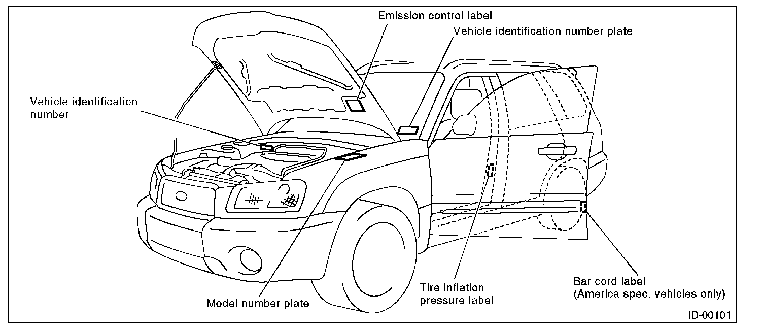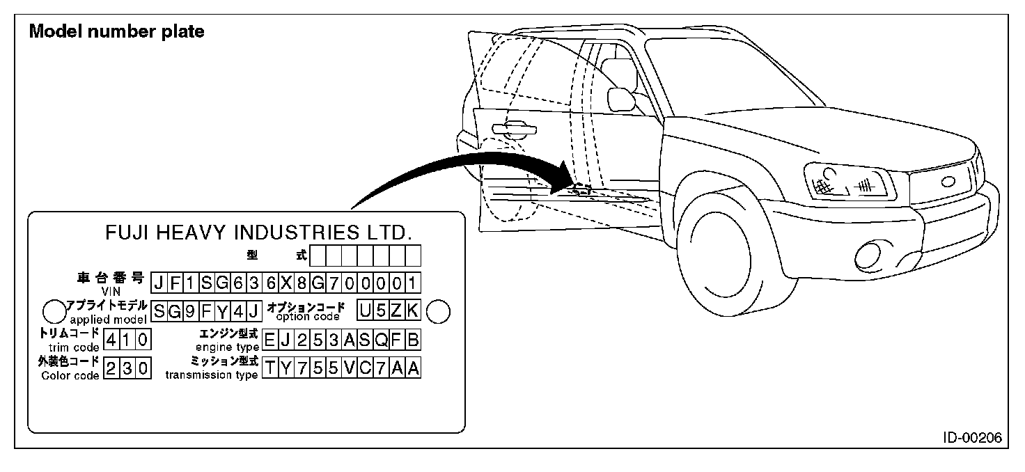 The model number plate indicates: the applied model, the option code, the trim code, the engine type, the transmission type, and the exterior color code. This information is helpful when placing orders for parts.