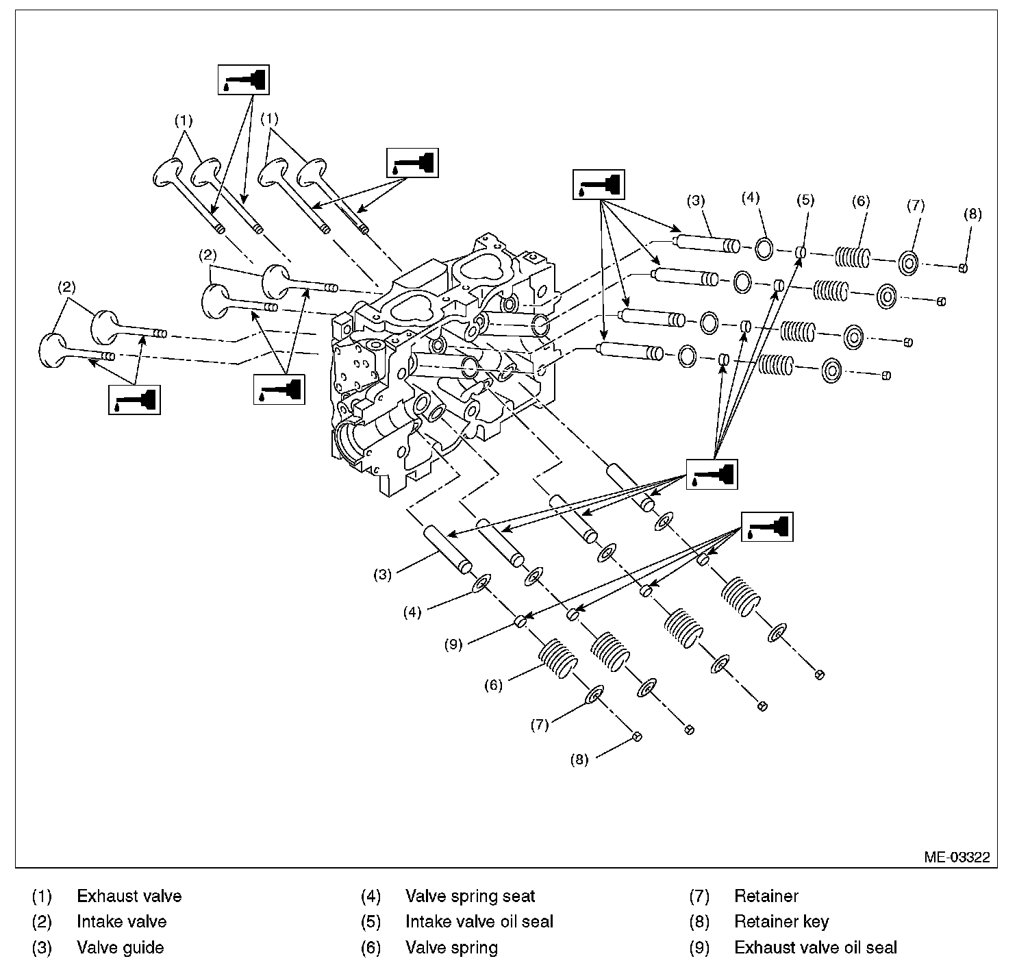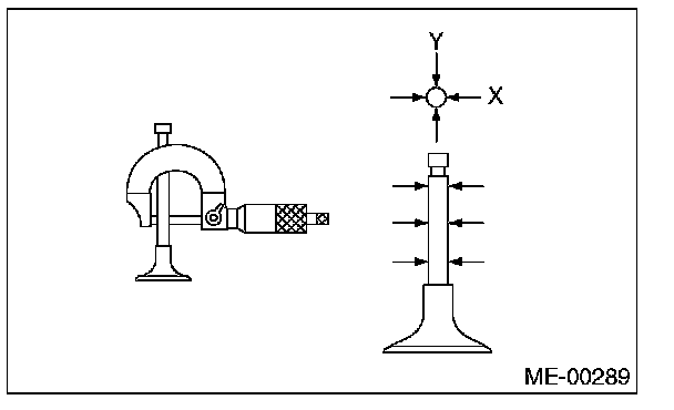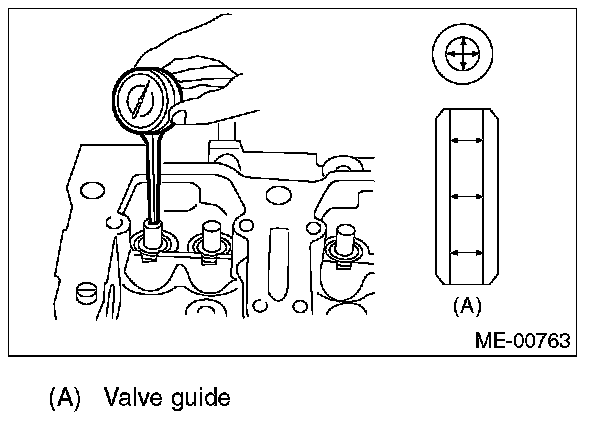 1) Check the clearance between valve guide and valve stem. The clearance can be checked by measuring respectively the outer diameter of valve stem with a micrometer and the inner diameter of valve guide with a caliper gauge.