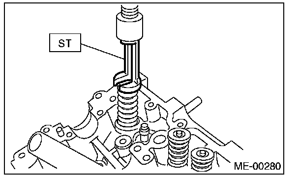 2) Compress the valve spring and remove the valve spring retainer key using ST. Remove each valve and valve spring.
