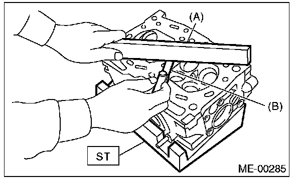 3) Measure the warping of the cylinder head surface that mates with crankcase using a straight edge (A) and thickness gauge (B).
