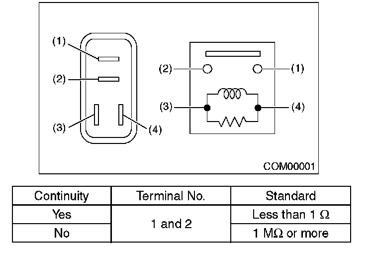 Measure the security horn relay resistance between terminals (indicated in the table below) when connecting terminal No. 4 to battery positive terminal and terminal No. 3 to battery ground terminal.