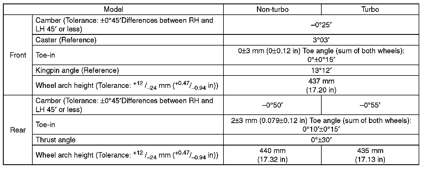 ^ Front and rear toe-in and front camber can be adjusted. If the toe-in or camber tolerance exceeds specifications, adjust toe-in and camber to the middle value of specification.