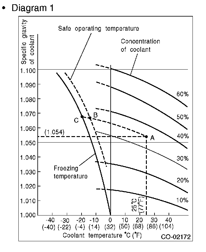 The concentration and safe operating temperature of engine coolant is shown in Diagram 1. Measuring the temperature and specific gravity of the coolant will provide this information.