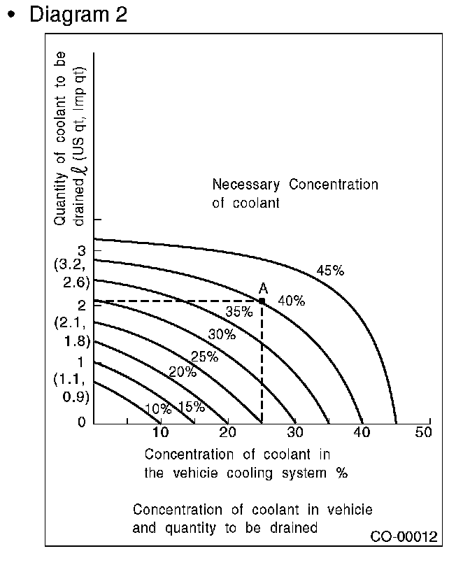 Assume that the engine coolant concentration must be increased from 25% to 40%. Find point A, where the 25% line of engine coolant concentration intersects with the 40% curve of the necessary engine coolant concentration, and read the scale on the vertical axis of the graph at height A. In this case, the amount of engine coolant to be drained is 2.1 l (2.2 US qt, 1.8 Imp qt). Drain 2.1 l (2.2 US qt, 1.8 Imp qt) of engine coolant from the cooling system and add 2.1 l (2.2 US qt, 1.8 Imp qt) of the undiluted solution of engine coolant.