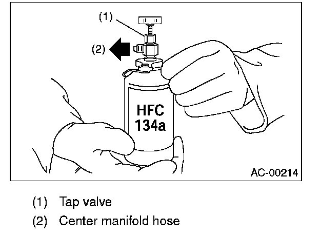18. If the HFC-134a source is empty, close all valves, close the valve on the can tap, and replace the empty source with a new part. After replacing HFC-134a source with a new part, and purging the air, restart the work.