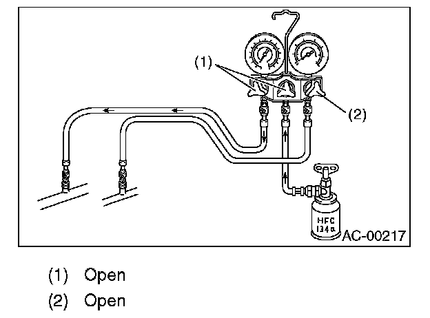 23. Open the low pressure side valve and fill the coolant to the prescribed level.