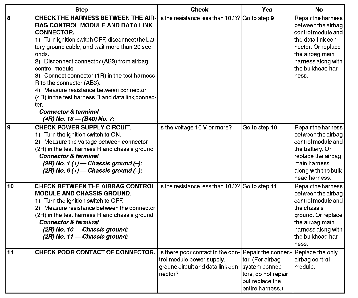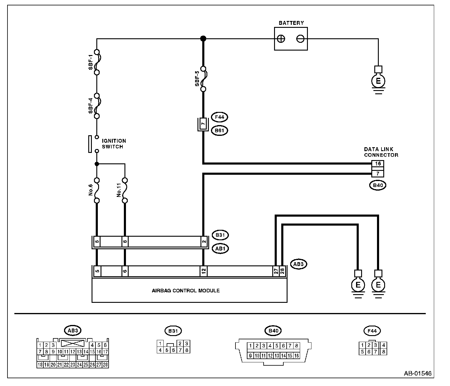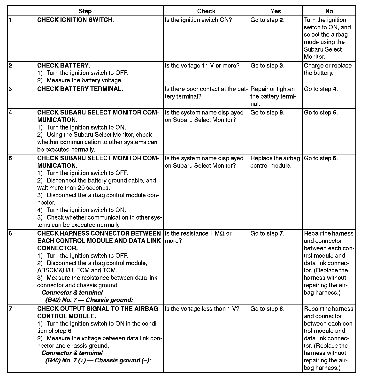 NOTE: When the airbag warning light is OFF and NO TROUBLE CODE is displayed on Subaru Select Monitor, the system is operating properly.