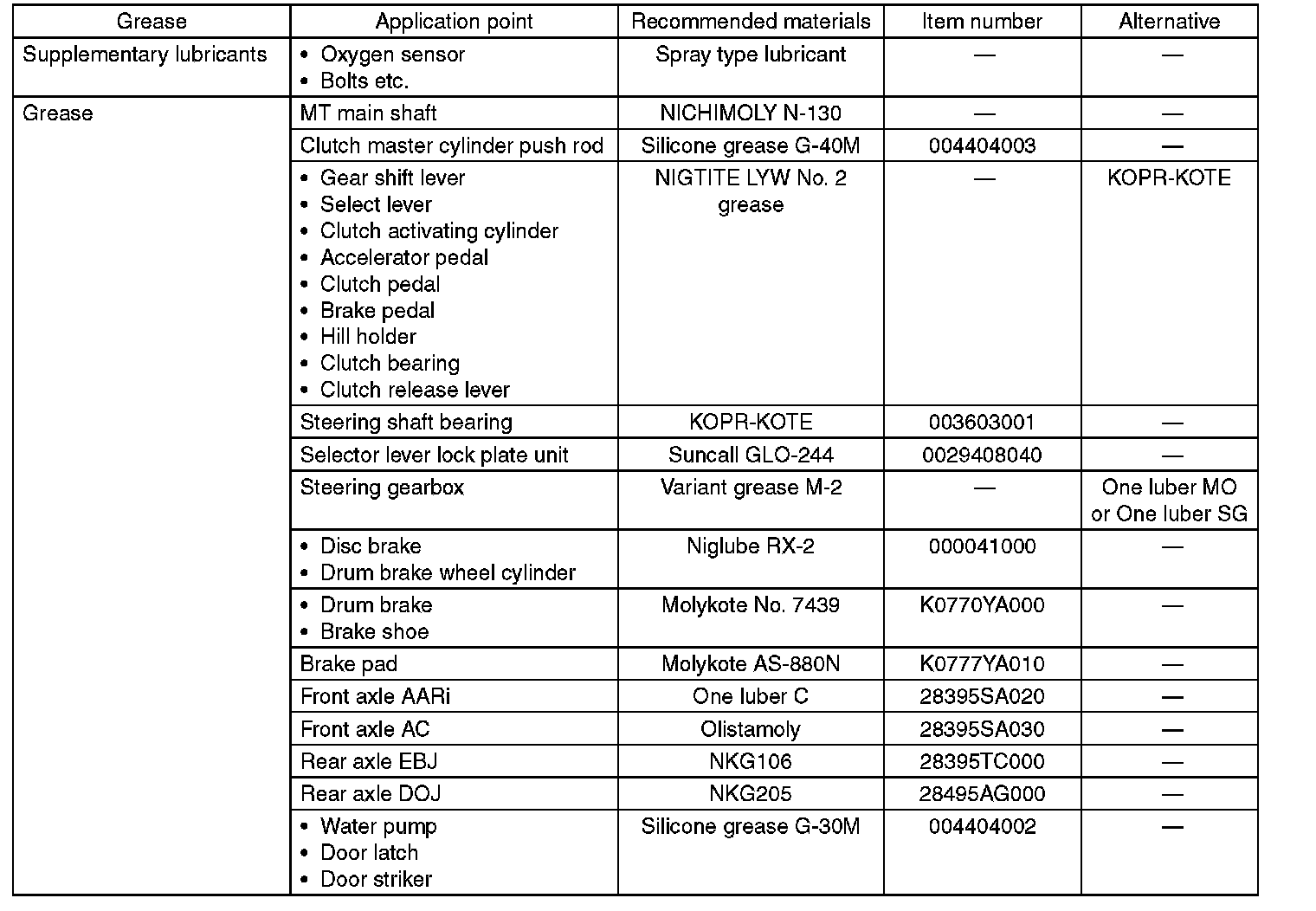 Use the grease and supplementary lubricants shown in the given table.