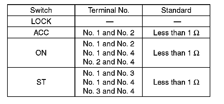 4. Turn the ignition key plate to each position and check the continuity between terminals of ignition connector.