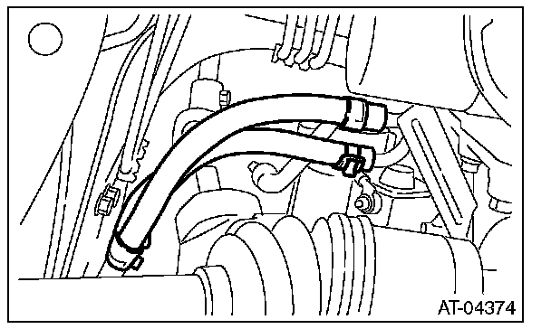 22) Disconnect the ATF cooler hoses from the pipes of transmission side, and remove the ATF level gauge guide.