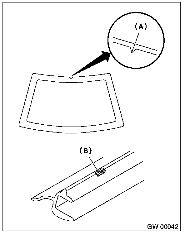 5. Peel away the backing paper of the double-sided tape. Align the molding mark (B) with the notch (A), affix the molding to the entire circumference of the edge of the glass, and press uniformly.