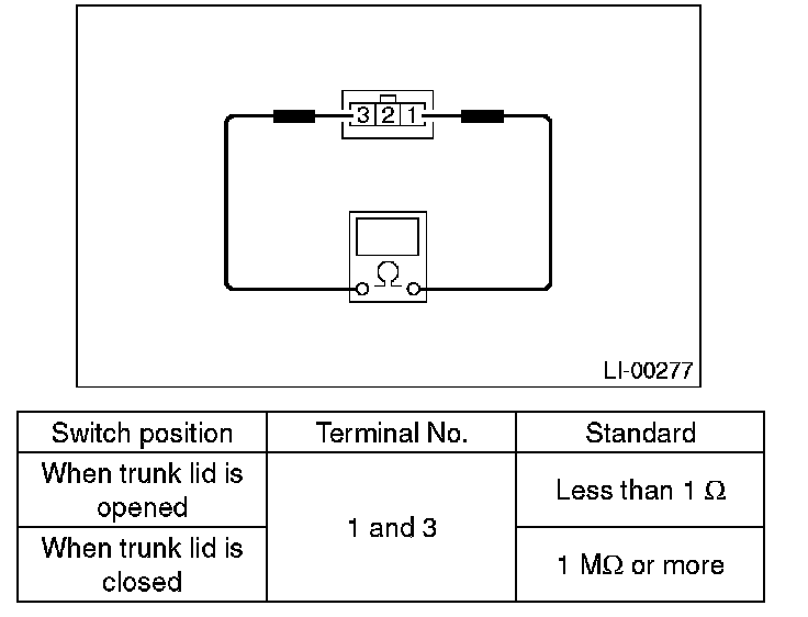 Measure the resistance between the trunk room light switch terminals.
