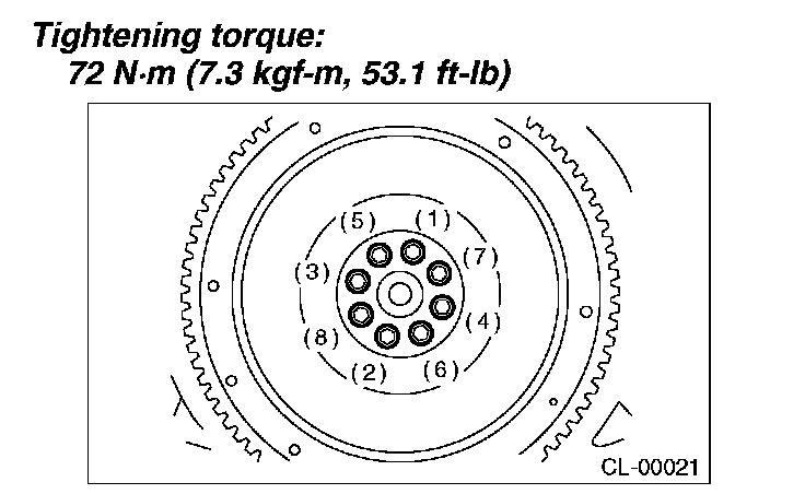 Tighten the flywheel attachment bolts gradually. Each bolt should be tightened to the specified torque in crisscross order.