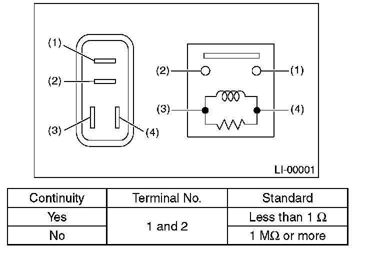 Measure the resistance between the tail and illumination relay terminals when connecting terminal No.4 to the battery positive terminal and terminal No.3 to the battery ground terminal.