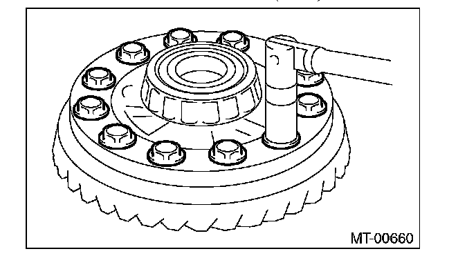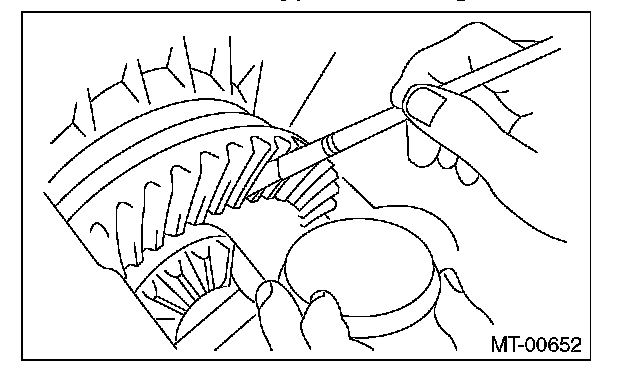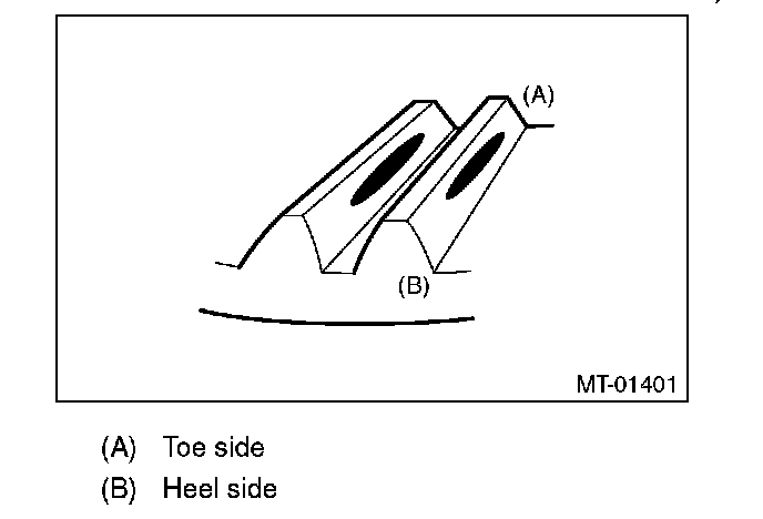 5) Remove the drive pinion shaft assembly, and inspect the mating condition of the teeth. If tooth contact is not correct, perform adjustment.