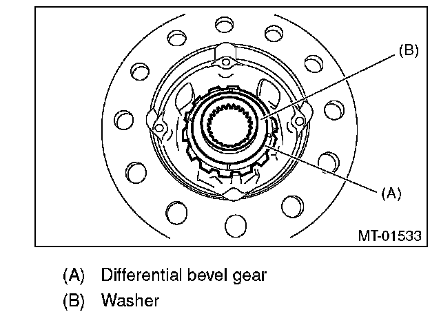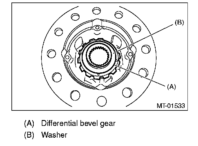 Measure the backlash of the differential bevel pinion. If backlash is not within standard value, install a suitable washer to adjust.