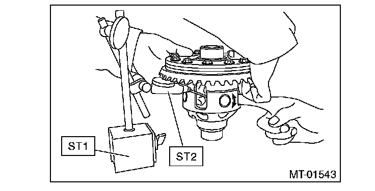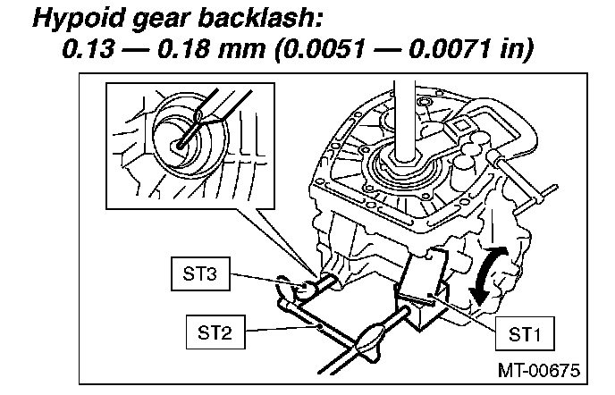 10) After turning the drive pinion shaft several turns, use the ST to measure the hypoid gear backlash.