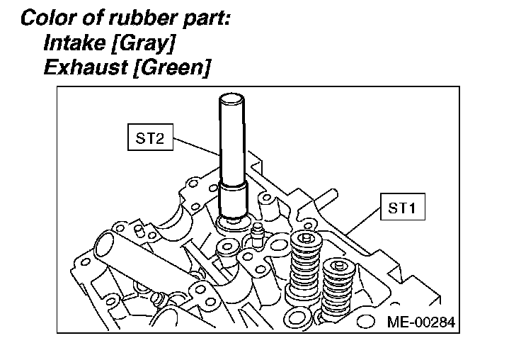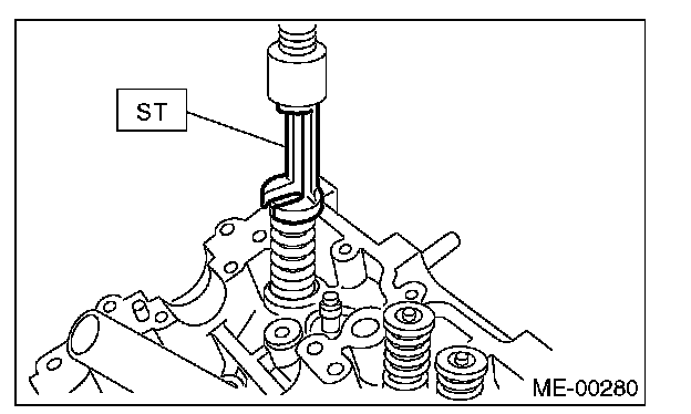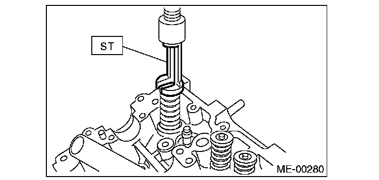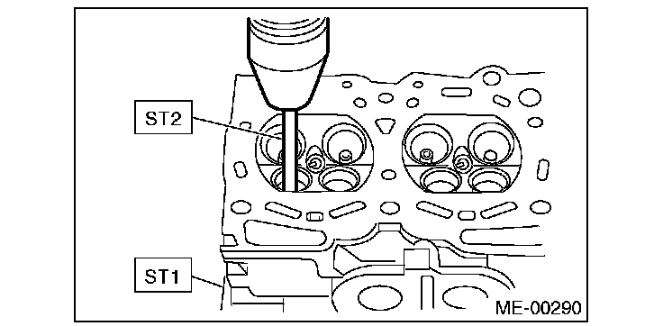 1) Place the cylinder head on ST1 with the combustion chamber upward so that valve guides fit the holes in ST1.