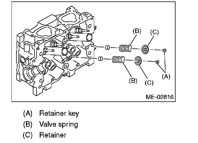 2) Compress the valve spring and remove the valve spring retainer key using ST. Remove each valve and valve spring.