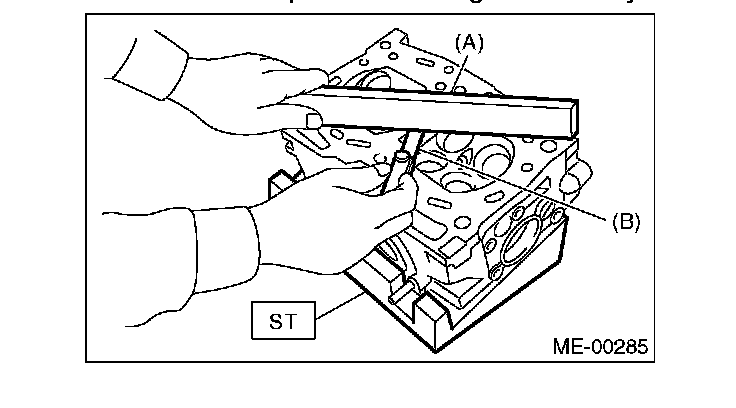 3) Measure the warping of the cylinder head surface that mates with cylinder block using a straight edge (A) and thickness gauge (B). If the warping exceeds the limit, correct the surface by grinding it with a surface grinder.