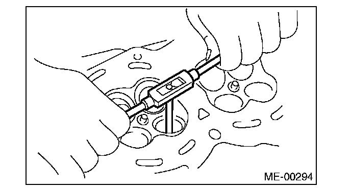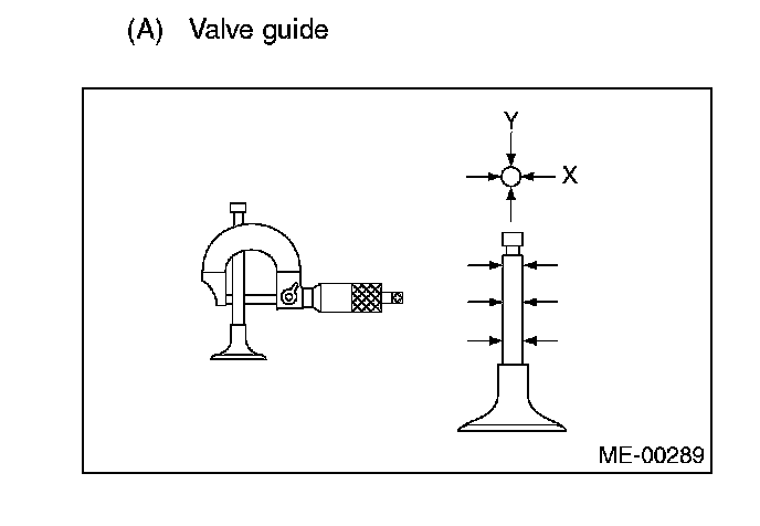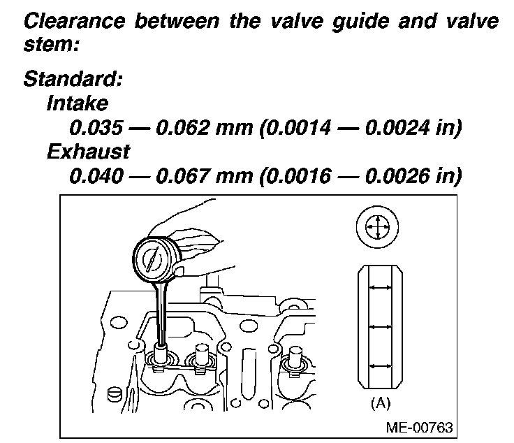 1) Check the clearance between valve guide and valve stem. The clearance can be checked by measuring respectively the outer diameter of valve stem with a micrometer and the inner diameter of valve guide with a caliper gauge.