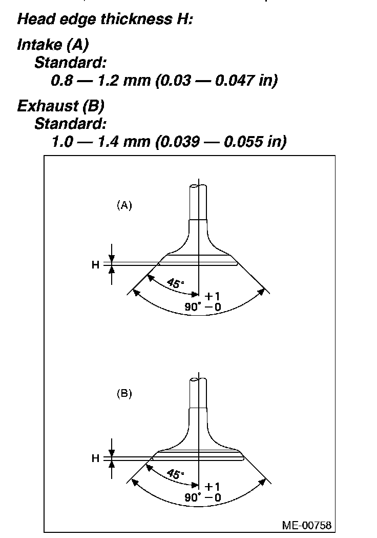 1) Inspect the flange and stem of valve, and replace the valve with a new part if damaged, worn, deformed, or if "H" is less than the specified limit.