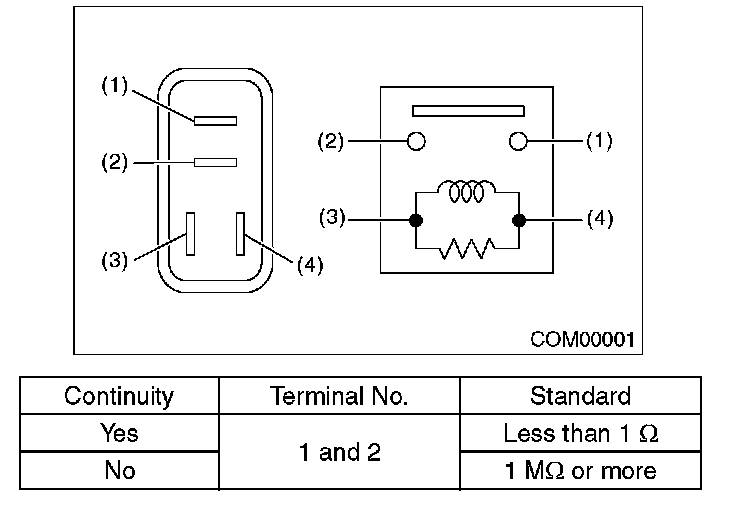 Measure the security horn relay resistance between terminals (indicated in the table given) when connecting terminal No. 4 to battery positive terminal and terminal No. 3 to battery ground terminal.